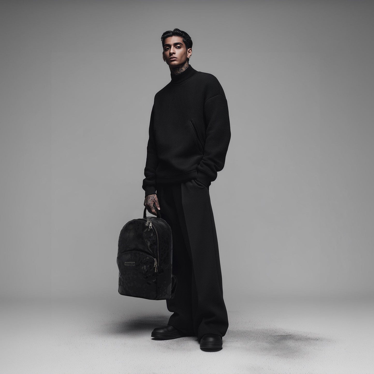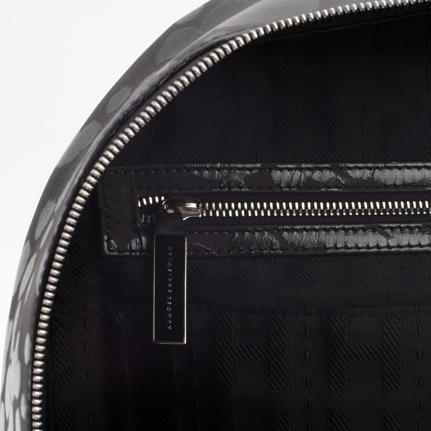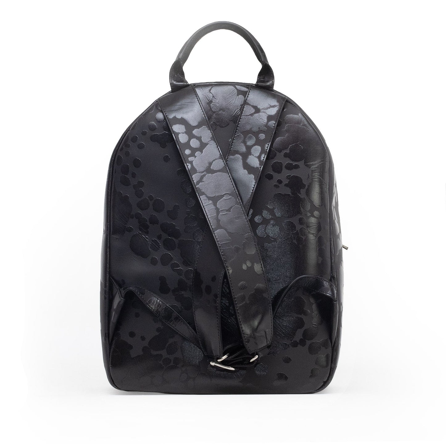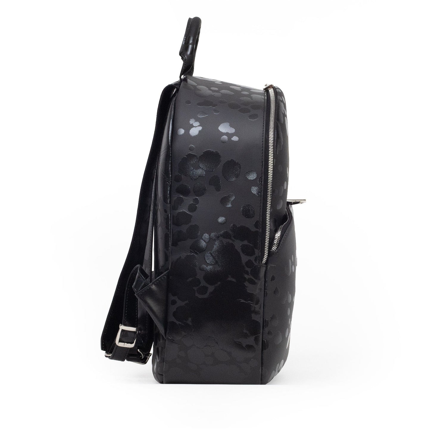 video of a black Italian leather back pack with spotted print and silver zippers.